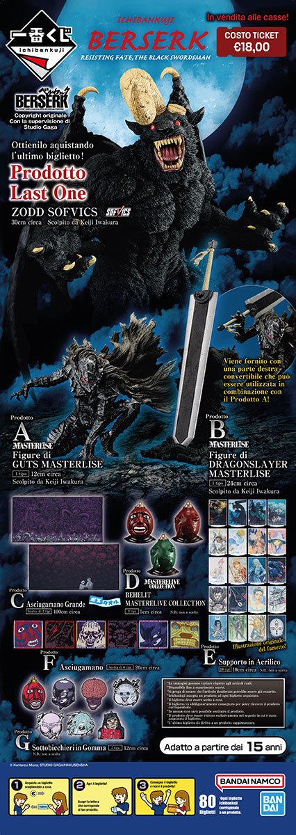 Che aspetti? Sfida la sorte acquistando uno o più biglietti dell’Ichiban KUJI Berserk Resisting Fate the Black Swordsman e scopri il tuo premio! Mi raccomando, affrettati! I biglietti totali sono solo 80!