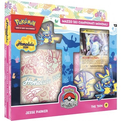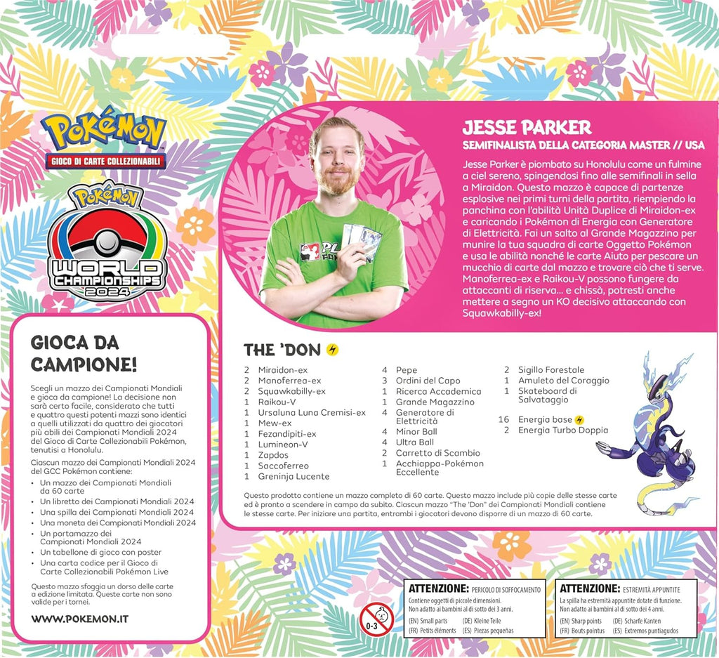 Gioca come un campione con una replica ufficiale del deck mondiale del semifinale del campione Jesse Parker, noto come “The ‘Don”, usato ai Campionati Pokémon 2024 a Honolulu 🇺🇸. Questo deck in lingua italiana ti offre la stessa esperienza competitiva del suo deck vincente, al cui centro c’è il potente Miraidon ex, passato alla storia per il percorso imbattuto di Parker nel torneo.