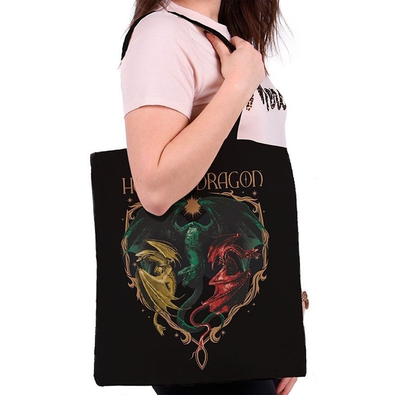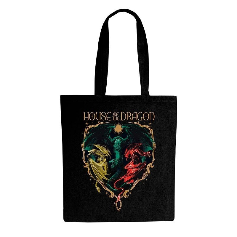 Porta i tre draghi più iconici della stirpe Targaryen sempre con te con la nostra fantastica Shopping Bag House of The Dragon Draghi! Questa morbida borsa è realizzata in 100% cotone, ed è decorata con Syrax, Caraxes and Vhagar, i draghi di Rhaenyra, Daemon e Aemond. Portala subito a casa tua!