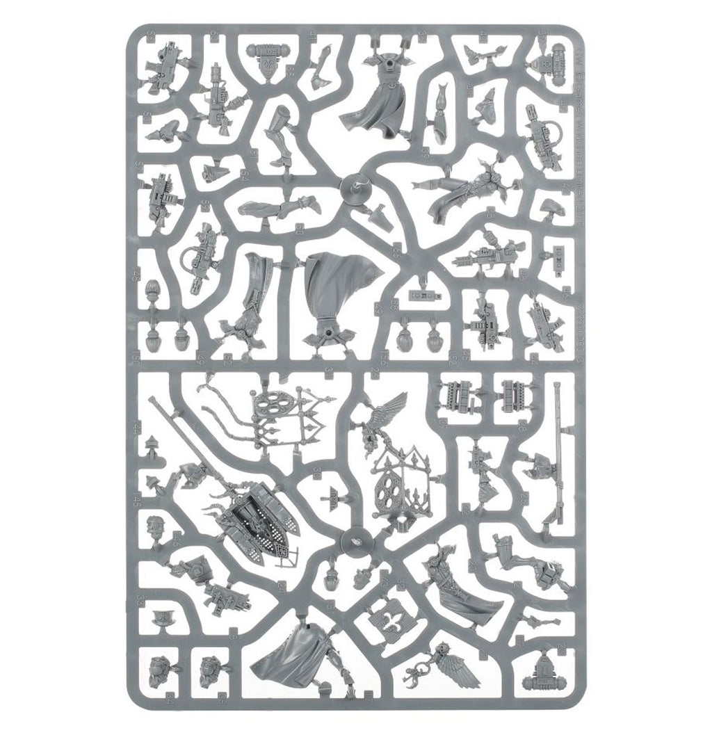 Con questo kit multicomponente di plastica puoi assemblare 10 Sorelle Guerriere, accompagnate da un Cherubino Incensiere. Ogni Sorella Guerriera è equipaggiata con un fucile requiem, in più una può sorreggere un sacro simulacrum imperialis, realizzato con le ossa di un santo. Sono guidate da una Sorella Superiora, che ha disposizione un autentico arsenale: una spada a catena o una spada potenziata per il corpo a corpo, affiancata da una pistola plasma, una pistola requiem, un fucile requiem, un condemnor o vari tipi di combiarma. Il kit include inoltre numerose armi speciali da assegnare alle Sorelle Guerriere: lanciafiamme, fucili termici e requiem Tempesta, ma anche un requiem pesante e un lanciafiamme pesante, se occorre ancora più potenza.